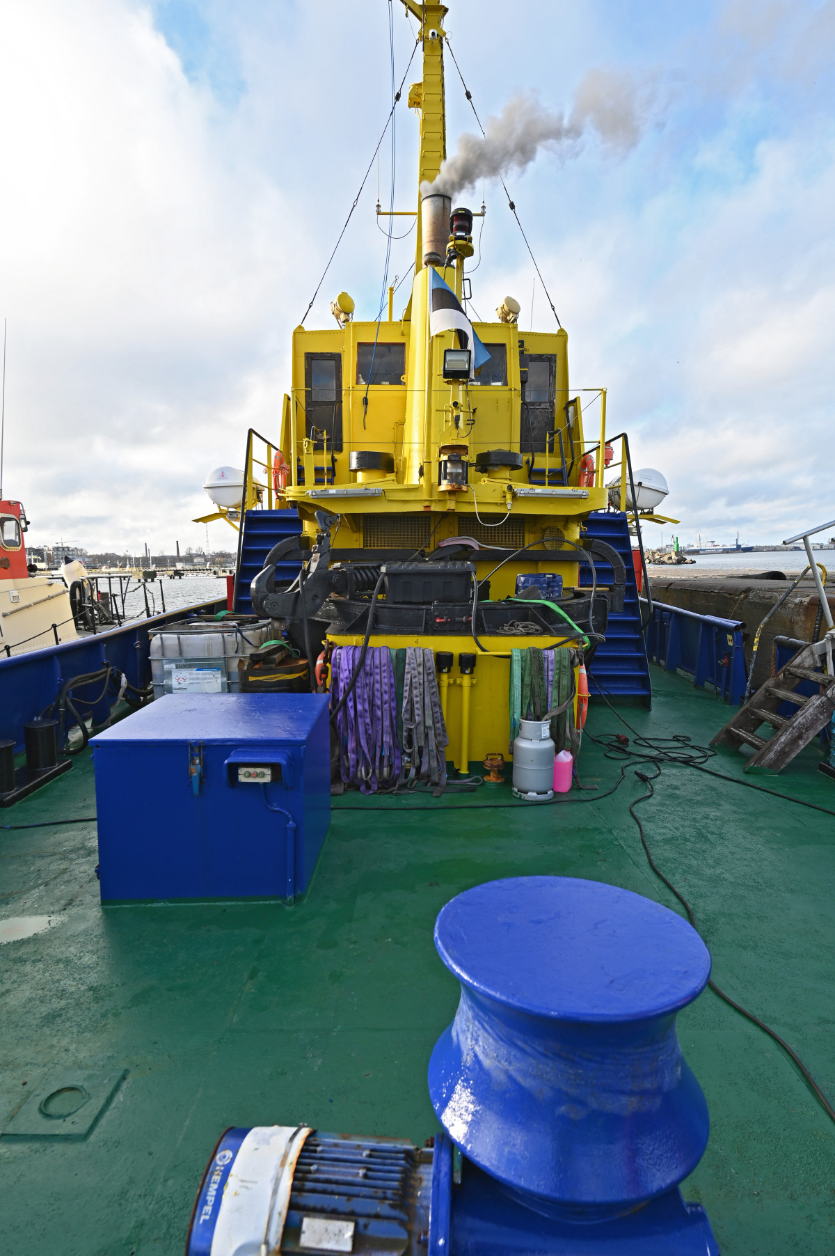 Däck och utsida. På akterdäck fins en HIAB-hydraulkran och bogserkrok. Lejdare till styrhytt. På fördäck finns ankarspel med kapstan.