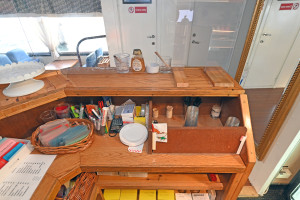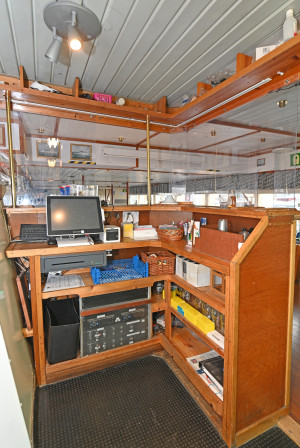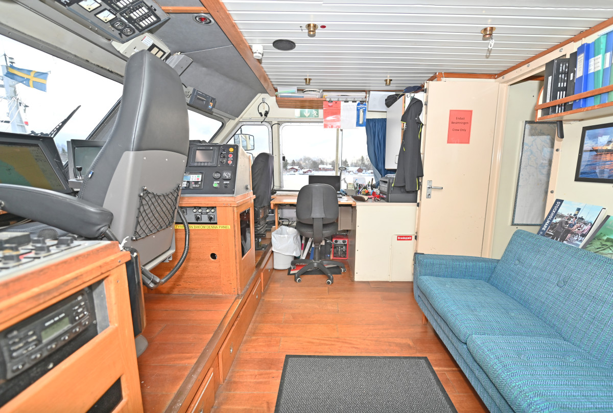 Styrhytt. Rymilg styrhytt med soffa och mindre kontorsplats. Utrustad med två Furunoradar och GMDSS radio. Personaltoalett i anslutning.