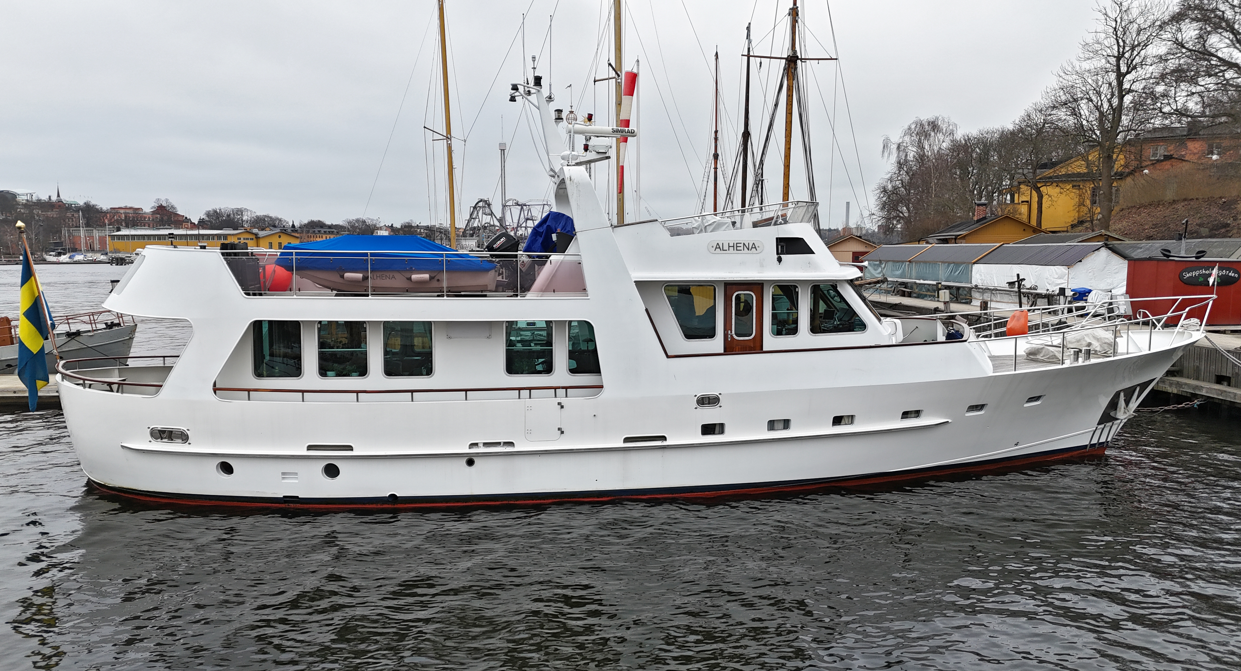Alhena kan inspekteras på Skeppsholmen i Stockholm efter överenskommelse med Shipsforsale.