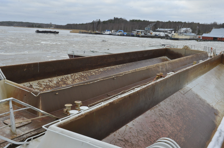 Split Hopper barge "Heta" lastar 300 kubikmeter. Elverk på däck som driver hydrauliken. 44,8 x 7,5 meter.