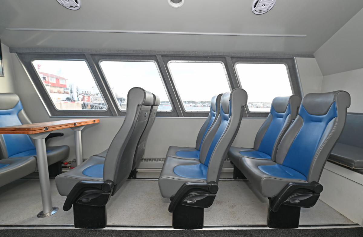 The interior includes 16 passenger seats with USB charging, two two-person sofas and two tables. The boat is handicap accessible and a wheelchair can be placed and secured in the wheelhouse.