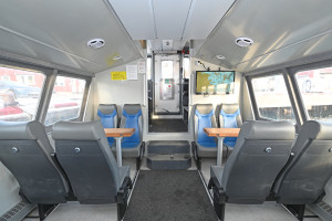 Salong with seating for 16 passengers in chairs and 4 in sofas. Two tables. Route info on flatscreen.