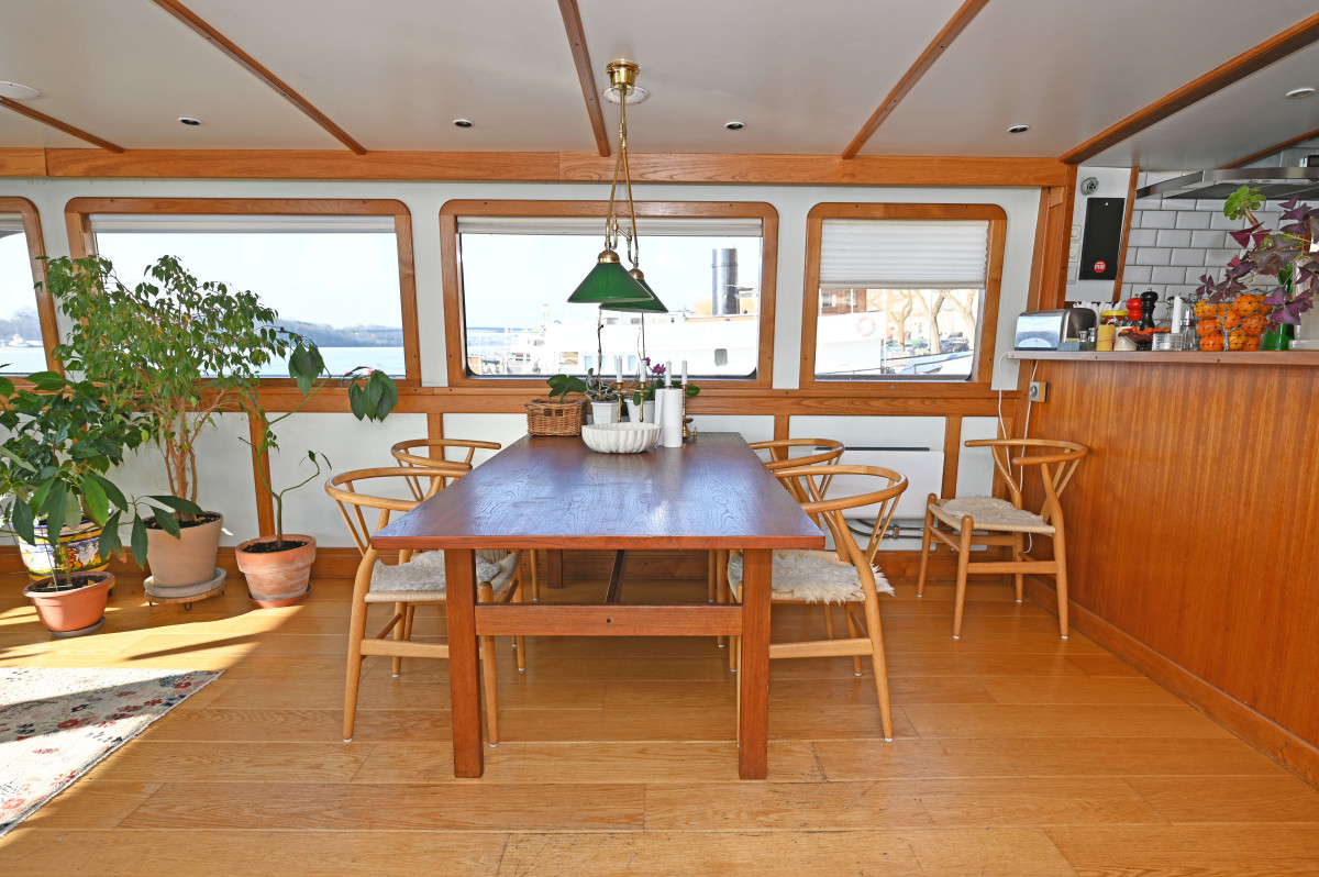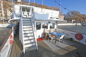 On board there are several social areas both on deck and below deck, including a spacious sun deck with seating area as well as a large main saloon with fireplace and direct access to the aft deck. The vessel is also fitted with a fully equipped galley and several seating areas for dining and socialising. Below deck there are generous accommodation spaces with several cabins, storage rooms, a bathroom with bathtub as well as a saloon, providing good comfort for extended stays on board as well as for larger parties.