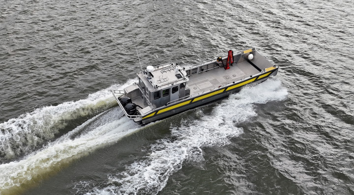Fully equipped work boat from MS Boat, built in aluminum in 2021. Load capacity approx. 6 tonnes, the cargo deck measures approx. 7 x 3 m.